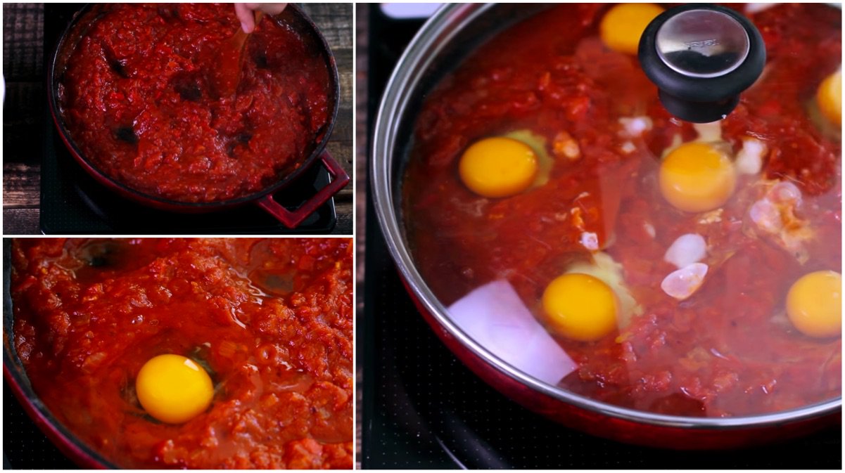 Cuando notemos que el agua se ha evaporado y el tomate cambia de color, con una cuchara, crear varios huecos para que encajen los huevos, con cuidado de no romper la yema. Cubrir la sartén con su tapa.