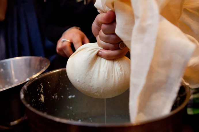 3 . Luego del reposo, vierte la mezcla sobre una gasa de algodón hidrófilo, ciérrala y aprieta con fuerza para separar el cuajo y el suero.