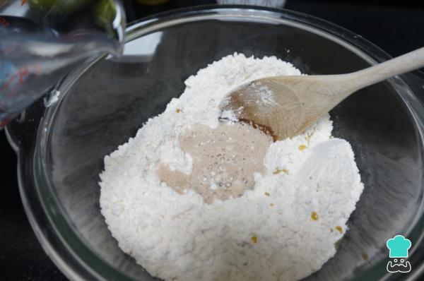 Pon la harina en un recipiente hondo junto a la levadura y el aceite. Lejos de la levadura incorpora la sal.
