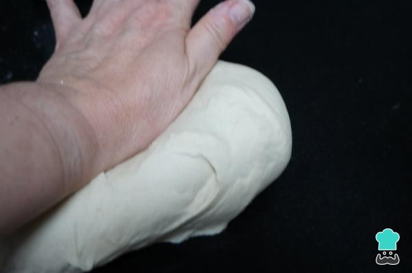 Coge un trozo de masa y forma un rectángulo y enrolla hasta obtener un cilindro alargado.