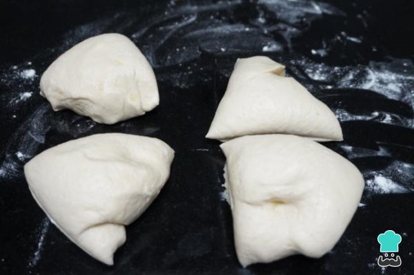Tras ese tiempo la masa debe haber doblado su volumen. Pon la masa en la mesa y amasa otra vez. Forma una bola y córtala en tres cuartas partes, dependiendo de cuantas barras de pan quieras obtener.