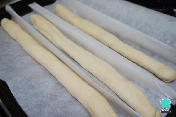 Repite lo anterior con otros trozos. Saca la bandeja del horno, ponle papel vegetal y pon las barras doblando un poco el papel para que separe las barras. Espolvorea harina y vuelve a tapar la masa con un paño, dejando reposar las barras por unos 45 minutos.