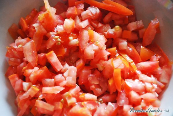 Picar el tomate en cuadritos, este corte también es conocido como brunoise.