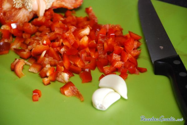 De la misma forma, cortar también el pimentón y los ajos puedes filetearlos.
