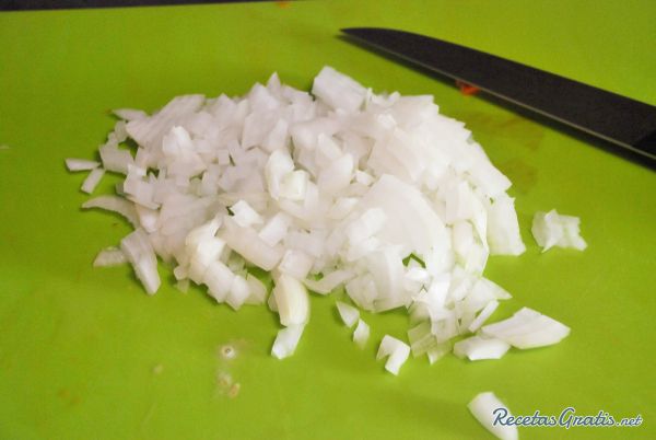 A continuación, cortar la cebolla también finamente. Un dato es que para evitar que al cebolla te haga llorar, debes utilizar un cuchillo bien afilado y separar un poco la tabla de cortar del cuerpo.