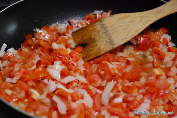 Calentar un chorrito de aceite en una sartén grande y hacer un sofrito con todos los ingredientes. Reservar aparte un puñado de pimentón.
