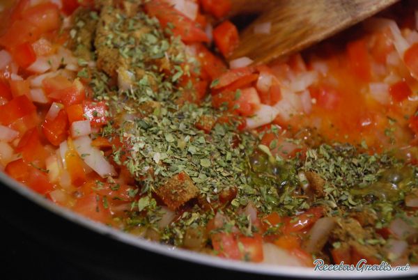 Cuando la cebolla empiece a cambiar de color añadir el orégano, el comino y la sal. Revolver todo bien y continuar con el sofrito unos minutos más.