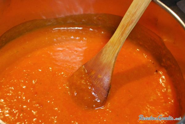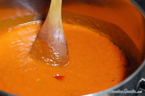Llevar la salsa a una olla y cocinar a fuego medio removiendo con una cuchara de madera.