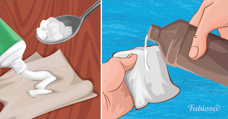 3. Mezclar cantidades iguales de pasta dental y bicarbonato de sodio. Esparcir sobre la superficie y frota.