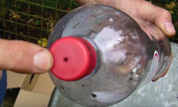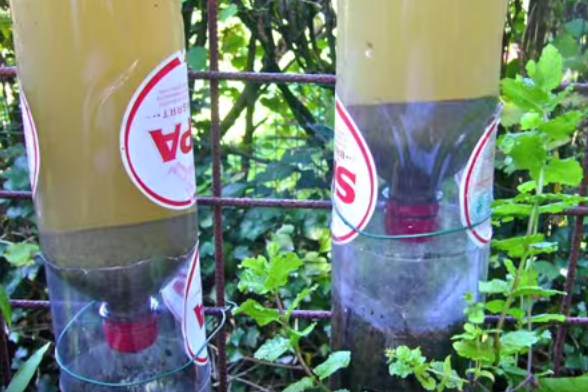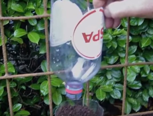 Fija la botella con alambre a una estructura de rejilla como la de la imagen: