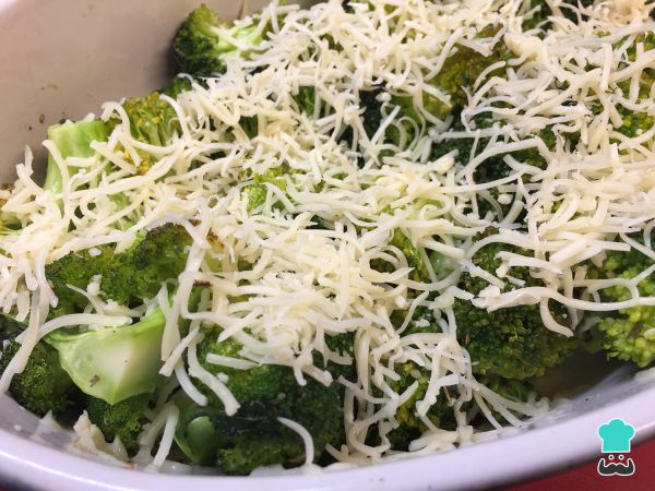 3. Hornea el brócoli durante 10 minutos aproximadamente, da la vuelta y espolvorea el queso, luego vuelve a hornear. Déjalo en el horno hasta que esté listo y el queso gratinado.