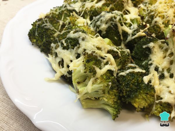 3. Hornea el brócoli durante 10 minutos aproximadamente, da la vuelta y espolvorea el queso, luego vuelve a hornear. Déjalo en el horno hasta que esté listo y el queso gratinado.