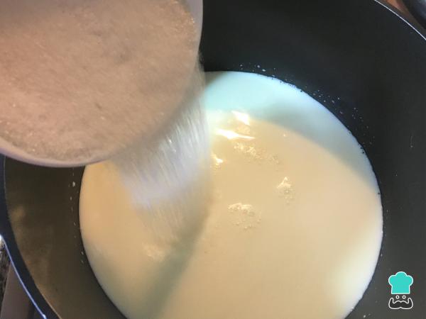 1 . En una olla gruesa vierte la leche entera y agrega el azúcar. Cocina a fuego mínimo, la cocción debe ser lenta y requiere que se vaya revolviendo constantemente para que no se quema en el fondo.
